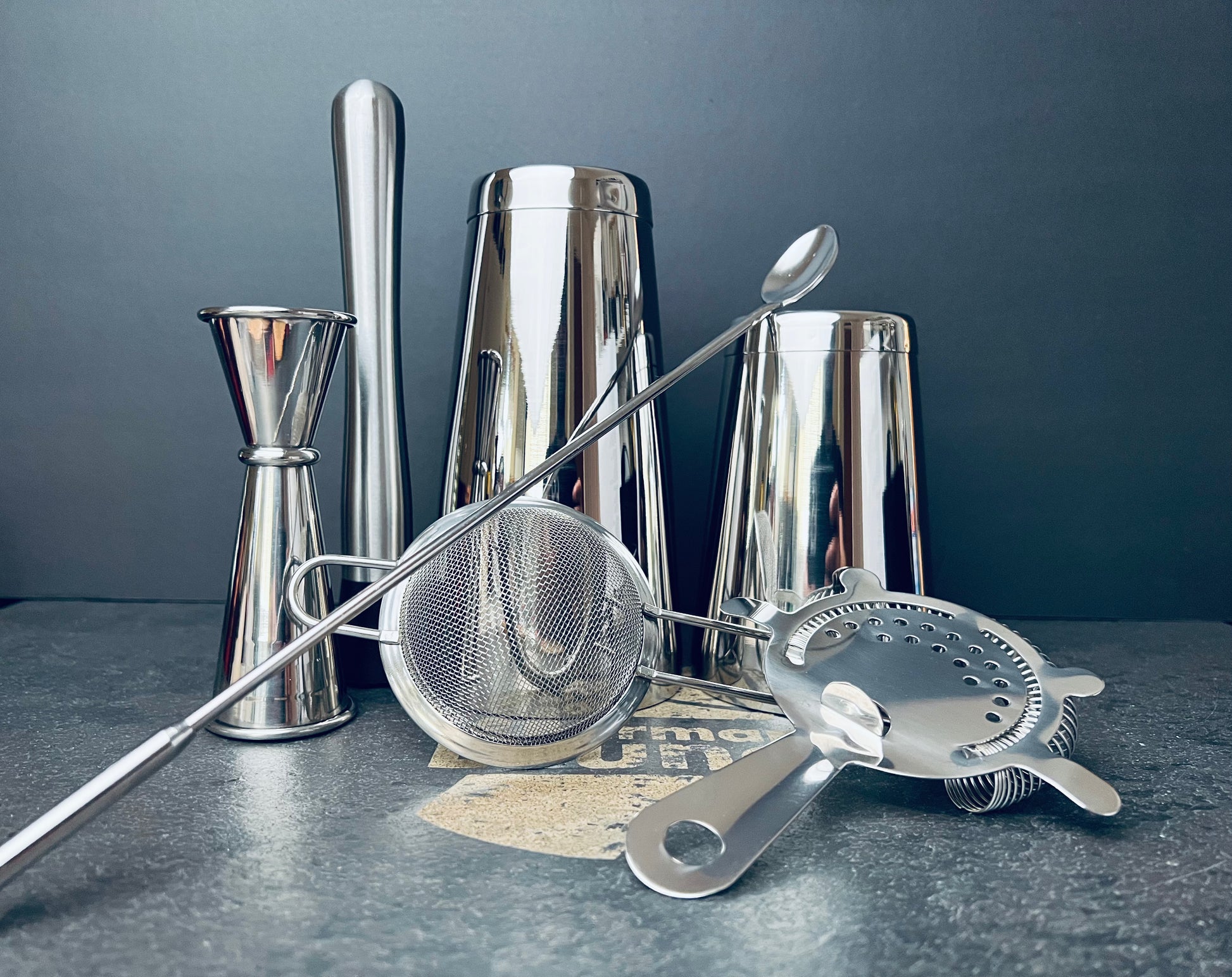 Donc en résumé, un shaker Boston fortifié qui ne coule pas, un doseur (1oz / 2oz) un pilon à cocktail, une passoire hawthorne, la seconde passoire pour filtrer finement en double et une cuillère de bar de 30 cm.