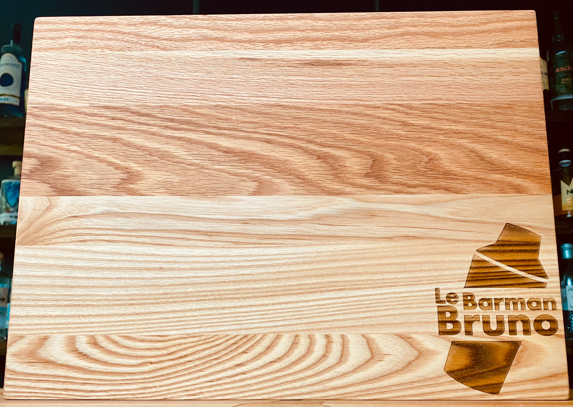 Planche à découper en bois avec logo gravé au laser Le Barman Bruno.