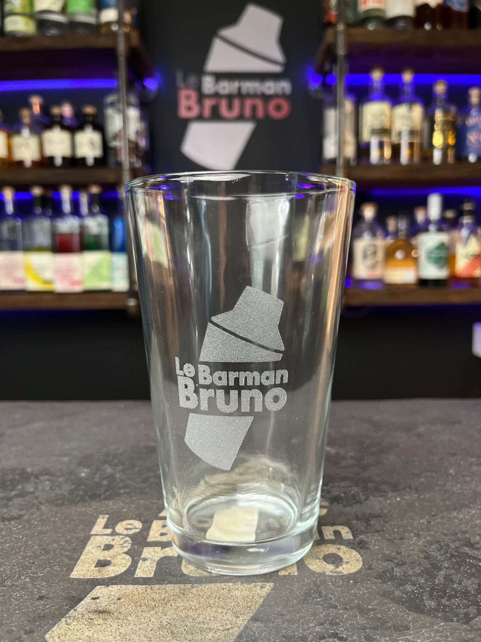 Verre à shaker en vitre de 16 oz signé Le Barman Bruno. Vous pourrez y réaliser les recettes de cocktail en temps réel pendant les lives.